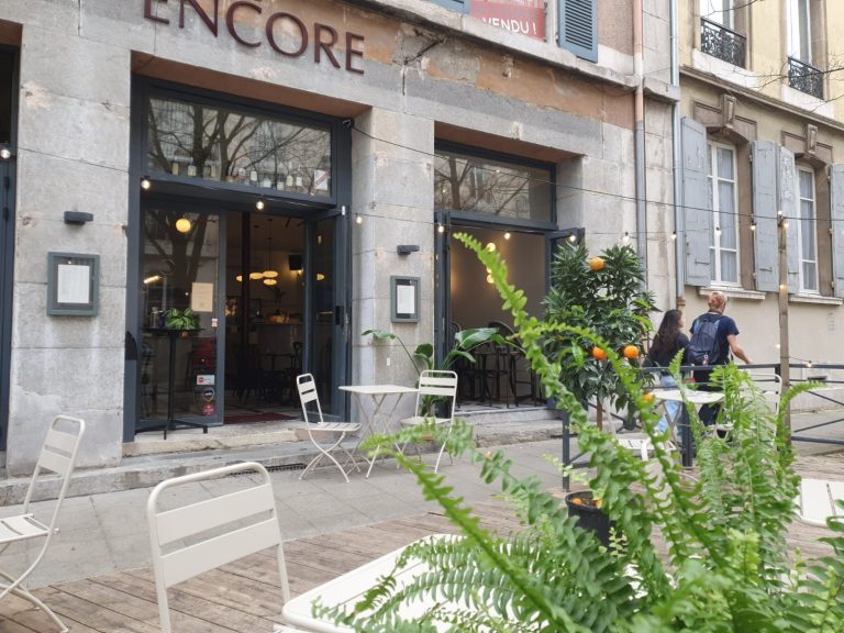 ENCORE s'organise autour d'une salle de restaurant (pour maximum 25 personnes), un buffet central, un bar, une épicerie fine et une terrasse dans l'une des plus belles rues de Grenoble.